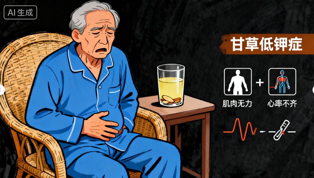 2️⃣甘草酸还会影响体内钾元素的代谢,导致钾离子流失,引发低钾血症。而钾元素对肌肉收缩、心脏功能至关重要,缺钾会直接导致双腿无力、走路“飘”,甚至可能诱发心律失常等严重问题。